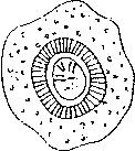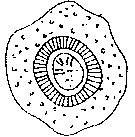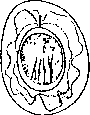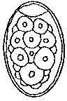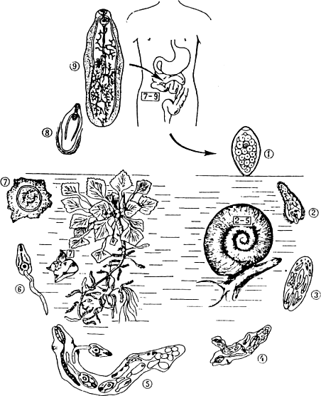 Bildo 8. Fasciolopso buska (Fasciolopsis buski): Nematura ovo (1) en kiu poste evoluas miracidio (2), per kiu infektiĝas limako. En tiu "unua intera gastiganto" disvolviĝas sporocistoj kun redioj (3) kiuj transformiĝas al patrinaj redioj kaj produktas idajn rediojn (4), el kiuj estiĝas cerkarioj (5). La cerkario (6) adheriĝas al akvoplanto (kiu servas kiel "dua intera gastiganto") kaj pluevoluas al encistigita metacerkario (7). Post ingesto, juna distomo liberiĝas el la metacerkaria ŝelo (8) kaj pludisvolviĝas en la intestokanalo al adolto (9). |