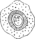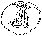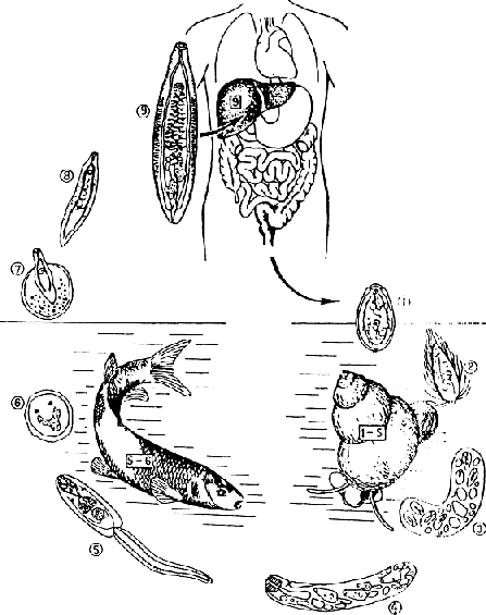 Bildo 9 Opistorĥido fela (Opisthorchis felineus): En la ovo (1) troviĝas miracidio (2) kiu liberiĝas en la "unua intera gastiganto" kaj evoluas al sporocisto (3) kaj redio (4), kiu produktas cerkariojn (5). La longvosta cerkario estas infekta por "dua intera gastiganto", en kiu ĝi disvolviĝas al metacerkario (5), kiu estas infekta por la "fina gastiganto". Post engluto liberiĝas juna distomo (8) el la metacerkaria ŝelo (7) kaj kreskas en la fingastiganta hepato ĝis adolta stadio (9). |