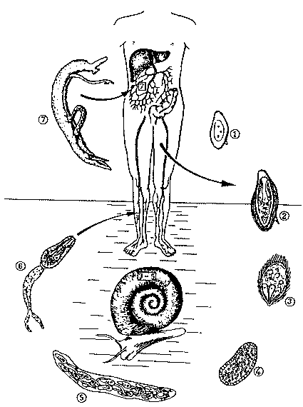 Bildo 7 Sĥistosomo mansona (Schistosoma mansoni) La freŝe demetita parazita ovo (1) en la fingastiganta vejno devas penetri tra la sangovazan vandon por atingi la intestan internon (lumenon). Per fekaĵo eligita ovo kun miracido (2) liberiĝas en la intera gastiganto (3) kaj transformiĝas al juna patrina sporocisto kun ĝermoĉeloj (4) el kiuj disvolviĝas idaj sporocistoj kun cerkarioj (5). La forkovosta cerkario (6) estas senpere infekta por la homo kaj traboras ties haŭton kaj kreskas al adolta stadio en la mezenteraj sangovazoj. |