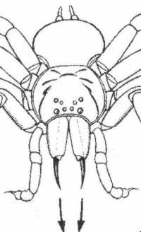 venenon tra la elirejo. La primitivaj araneoj, Mygalomorphae, havas antaŭen